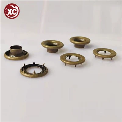 Spray Paint Eyelet er úr málmi og er mjög endingargott. Það samanstendur af tveimur hlutum. Einn hluti er kringlótt blaðbol með götum til að fara í gegnum skóreimar, reipi o.s.frv.; hinn hlutinn er sylgja eða þétting fest á bakhlið líkamans til að styrkja festingu og koma í veg fyrir slit.
